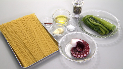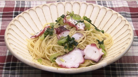 - パスタが茹で上がったら、軽く湯切りをしてフライパンに加え、タコも加えて温めるようにしながら和えていく。