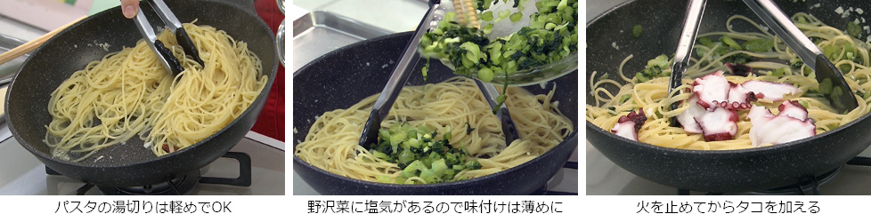 - 野沢菜を加え、味をみて塩・コショウかパスタの茹で汁で調えて出来上がり。