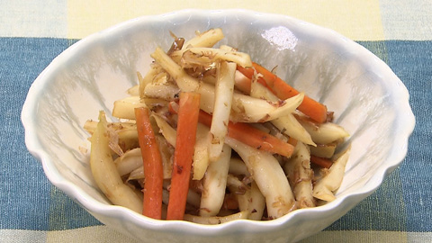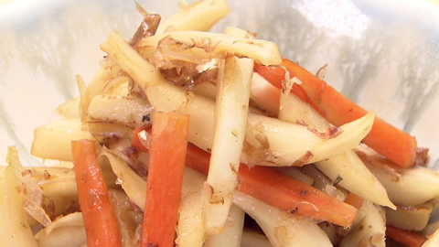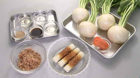 - カブの皮がしんなりしたところで残りの調味料を加えて全体に火が通ったら、仕上げにカツオ削り節をからめて完成。