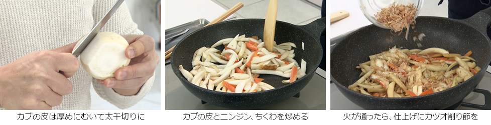 - カブの皮は厚めに剥いたほうが美味しく料理できます。その皮を捨てずに使う「無駄なし料理」です。