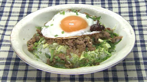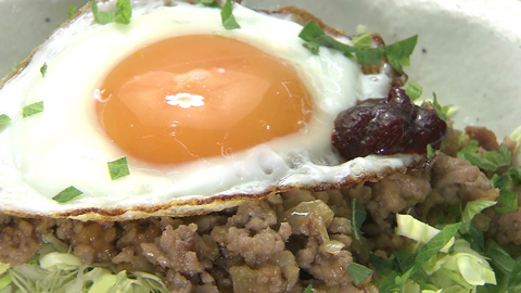 - その上に目玉焼きを乗せてシソの葉を散らす。