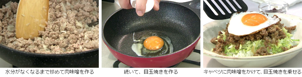- お皿にごはんを盛り付け、上にたっぷりのキャベツを乗せて肉味噌をかける。