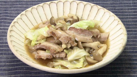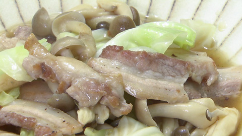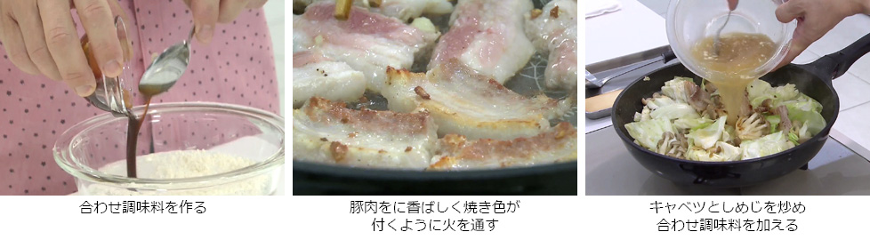 - ある程度肉に火が通ったらキャベツとしめじを加えて炒め、しんなりしたら合わせ調味料を加えて火を通す。