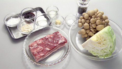 - キャベツをカット、しめじを小房に分ける。