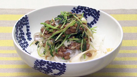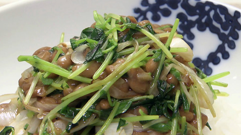 全体に火が通ったら、熱いうちに納豆と和え、醤油をかけて混ぜる。