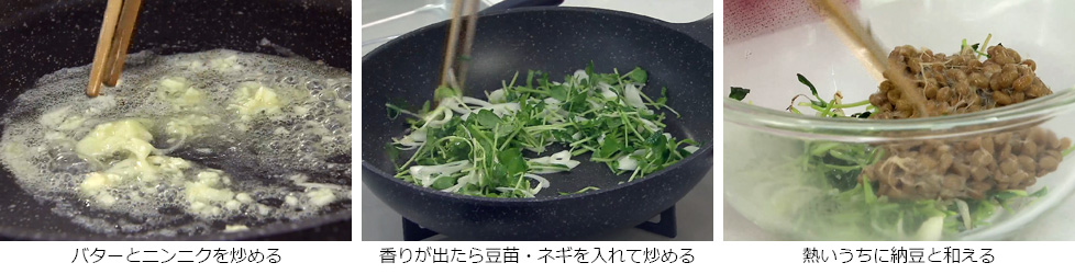 フライパンにバターとニンニクを入れて炒め、香りが出たら豆苗・ネギを入れて炒める。