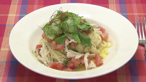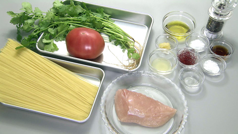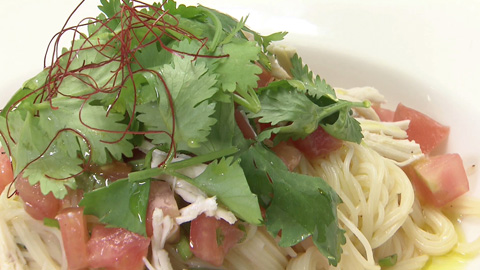 - 器にソースごと盛り付け、鶏むね肉をちらし、パクチーの葉と糸唐辛子を盛り付ける。