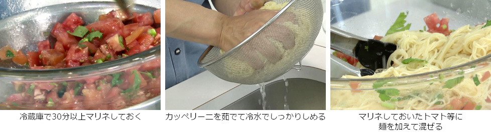 - カッペリーニをたっぷりのお湯で茹でる。冷水でしっかりしめ、ザルで水切り、さらに軽く押す、またはペーパー等でしっかり水を切る。