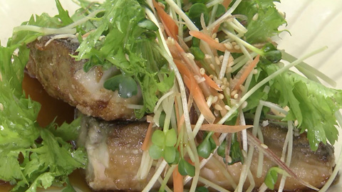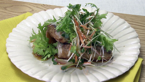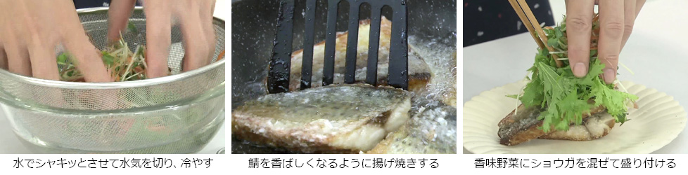 - 冷やしておいた香味野菜にショウガを混ぜて、揚げた鯖の上に盛り付ける。