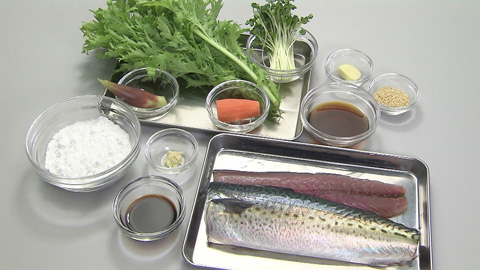 - 三枚下ろしにしたサバに醤油・おろしショウガで下味をつけておく。