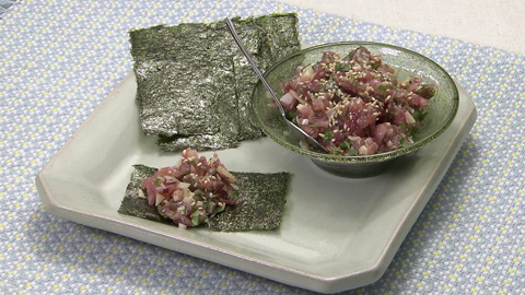 - お皿に焼きのりを乗せ、その上に カツオなめろう を盛り付ける。