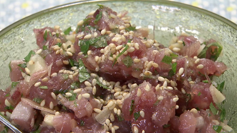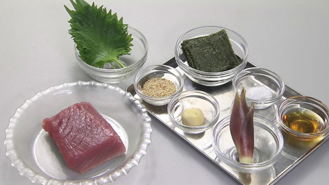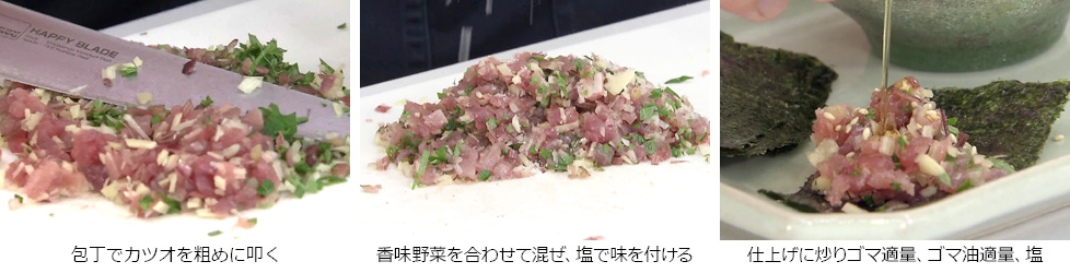 - ボウルにカツオと香味野菜を合わせて混ぜ、塩で味を付ける。