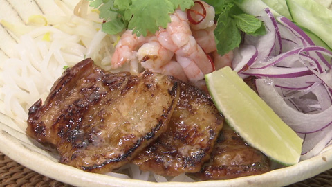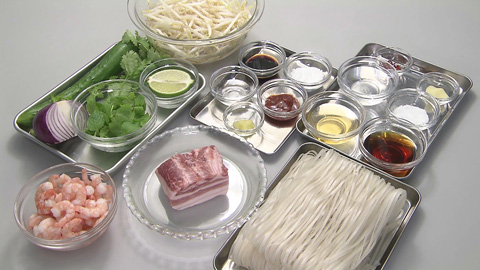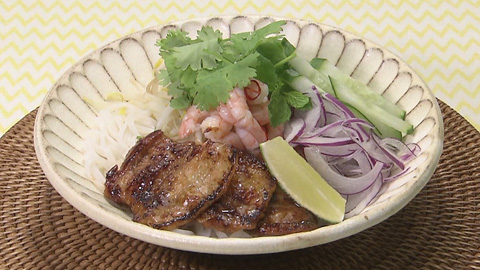 - 器にフォーを盛り付け、豚バラ肉・茹でむきエビ・モヤシ・キュウリ・紫タマネギ・パクチー・ミント・ライムを盛り付け、フォーのたれ を適量かけて出来上がり!
