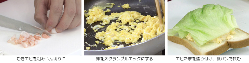 - ボウルにむきエビとスクランブルエッグマヨネーズを合わせ、塩コショウで味を調える。