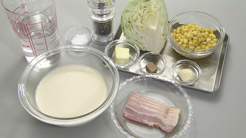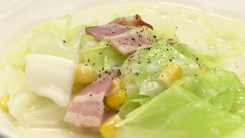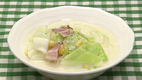 - キャベツ・コーンを入れて炒め、キャベツがしんなりしたら、水・調整豆乳・固形コンソメを入れ、塩コショウで味を調える。