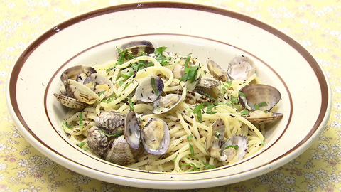 - 味が決まったらアサリを戻して、皿に盛り付ける。