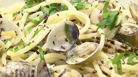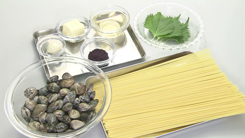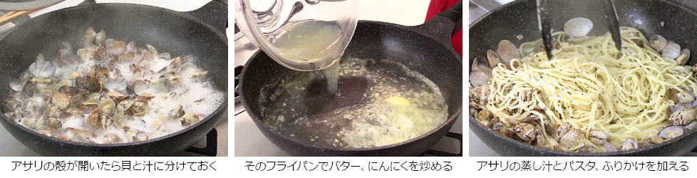 - アサリの蒸し汁と軽く湯切りしたパスタ・シソ風ふりかけを加え、全体をあおって味付けする。