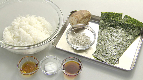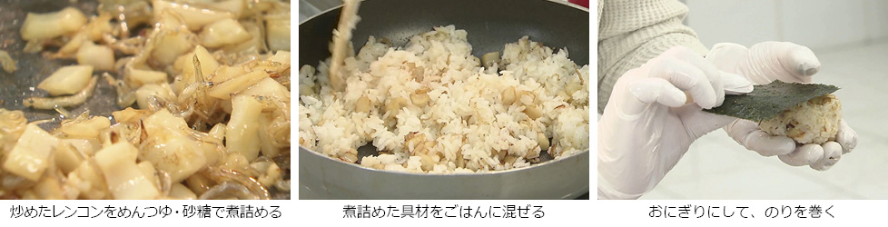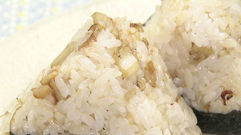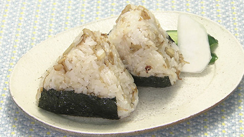 - 煮詰めた具材をごはんに混ぜ、おにぎりにし、のりを巻く。お好みで、きゅうりの漬けもの等と一緒に器に盛る。