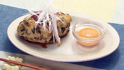 - しんなりしたら合わせ調味料を加え、火が通ったら器に盛りつけ 白髪ネギと卵黄を添えて完成。