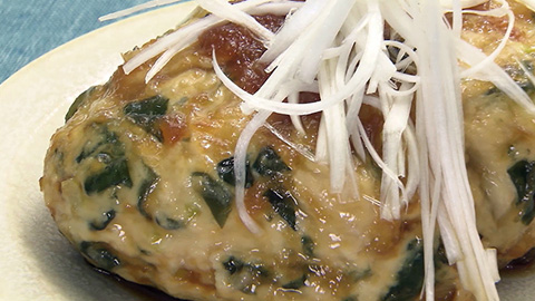 - それを4等分にしてハンバーグ状に丸め片栗粉をまぶし、沸騰しない火加減のお湯で10分茹でる。
