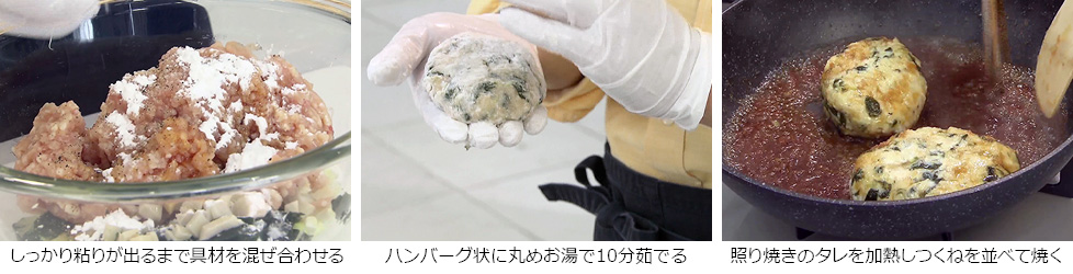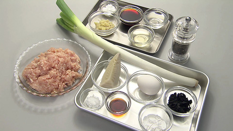- ボウルに ひき肉・ネギみじん切り・タケノコ・ワカメ・醤油・塩・コショウ・卵白・片栗粉(大さじ1程度)を合わせしっかり粘りが出るまで混ぜ合わせる。