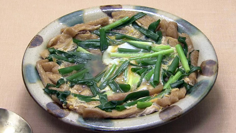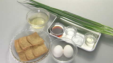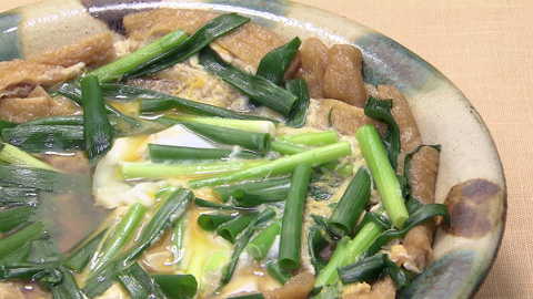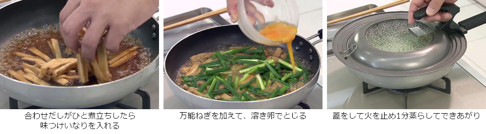 鍋に合わせだしの材料を入れて火にかけ、ひと煮立ちしたら味つけいなりと万能ねぎを加えて、溶き卵でとじる。