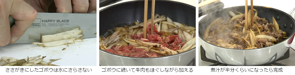 鍋に砂糖・みりん・酒・しょう油を入れて火にかけショウガ・玉ねぎ・ゴボウを加える。
