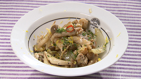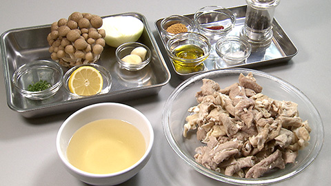 - 鍋にオリーブオイルをひいて牛肉・サトイモ・タマネギ・しめじを入れ、軽く塩・コショウをして炒める。