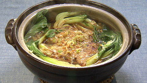 - チンゲンサイを鍋の縁に沿ように入れ長ネギ・ラー油・白炒りごまを加え火が通ったら完成。