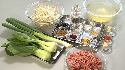 - ひき肉を加えてほぐしながら炒めて完全に火が通ったらもやしを加えてさらに炒める。