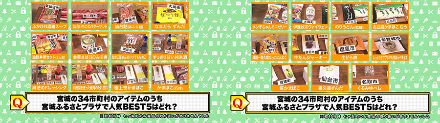 宮城ふるさとプラザで販売!宮城県内34市町村を代表する“ご当地アイテム”から人気TOP5を当てて!というもの。