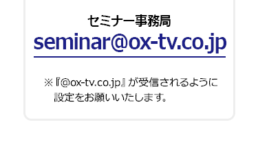 迷惑メールフィルター機能により事務局からのメールが届かない場合があります。「@ox-tv.co.jp」からのメールが受信できるよう設定をお願いします。
