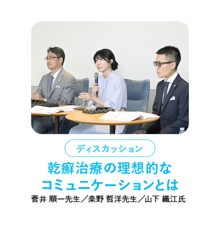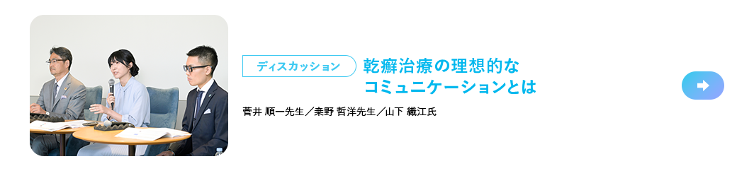 Shared Decision Making(SDM)という言葉があります。医学的な考え方だけではなく、患者さんの趣味や嗜好、ライフスタイルを踏まえて、患者さんと医療従事者が共同で治療方針を決めましょうという意味です。治療を続けていくなかで、治療法が合わない、効果が不十分だと感じる、もっと良くしたいと思うことがあったら、相談していただきたいです。その相手というのは医師だけではなくて、看護師さん、薬剤師さん、家族の方も含めて、みんなでより良い乾癬治療につなげていければと思います。