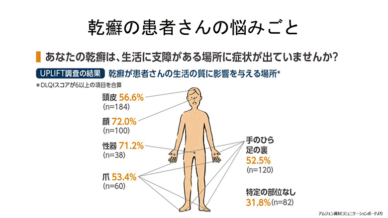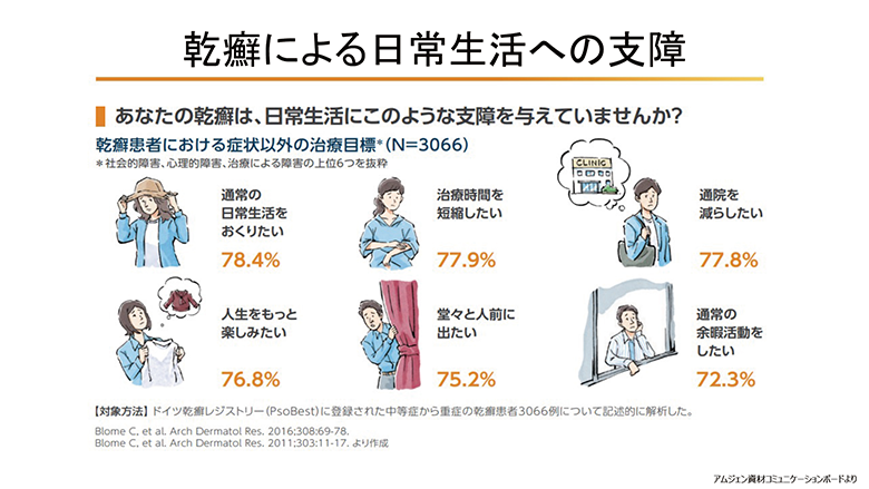 乾癬によって、症状だけではなく、生活でのお困り事が色々と増えます。日常生活を普通に送りたい、治療期間が長い、病院に行くのも大変、人生をもっと楽しみたい、通常の余暇の活動をしたい、など。こうして挙げてみると、乾癬の患者さんは特別なものを要求されているわけではなく、まず日常生活を普通に戻したいと思っていることを、私たち医師は考えなければいけません。