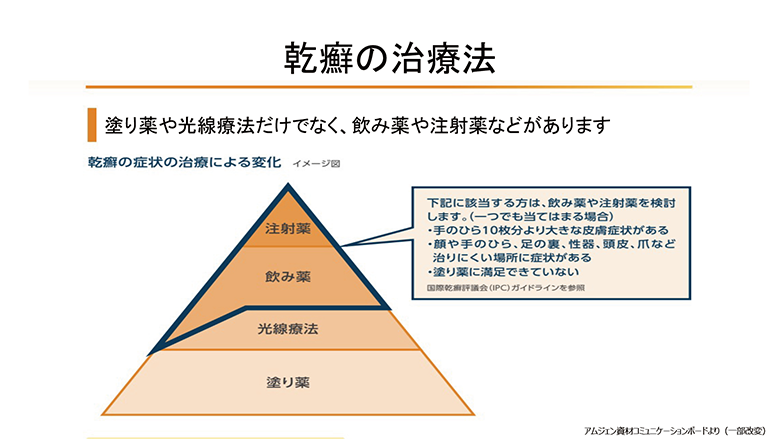 以前と比べて、乾癬の治療方法は増えてきています。塗り薬に加えて、飲み薬や注射薬などもあり、どれもめざましく進歩しています。紫外線による光線療法もあります。外用薬一つとっても効かないと思わずに、新しいお薬が出てきたらぜひ興味を持っていただきたいですし、いろんな選択肢があることをぜひ知っていただきたいです。