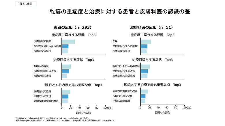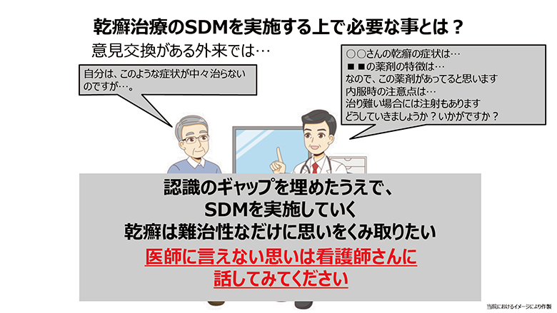 治療に対する希望や優先順位は患者さんによって異なり、患者さんと医師でも考え方は異なります。例えば、症状の感じ方については、医師は症状がある範囲の面積で重症か軽症かを判断してしまいがちですが、患者さんにとっては範囲が狭くても重症だと感じる方もいます。そうした認識のギャップを埋めるためにも、医療従事者と患者さんとの対話が大切なのです。