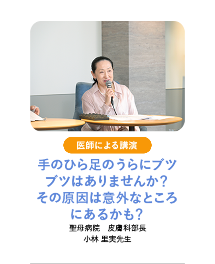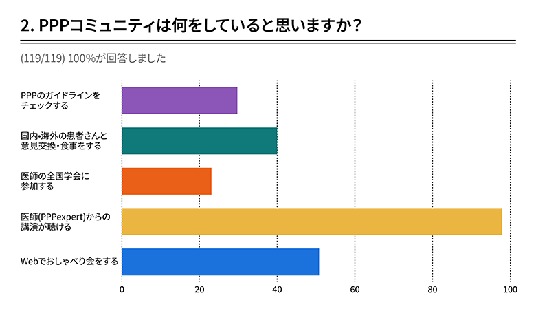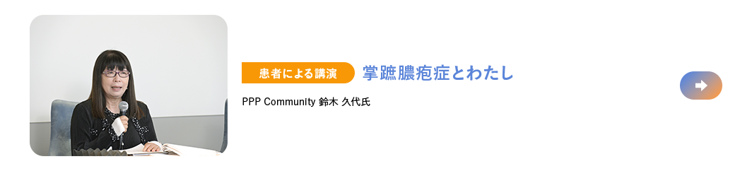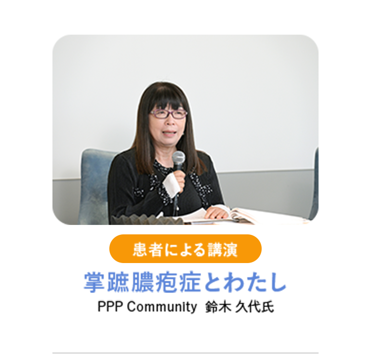 私たちPPPコミュニティは、掌蹠膿疱症という病気がどういうものなのか、何をしたらいいのかを理解し、認知度を高めるために、著名な先生方にご協力をいただいて講演をしています。困っていることがあれば、お力になれると思いますので、ご参加ください。