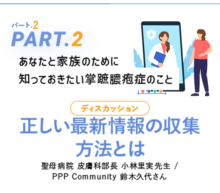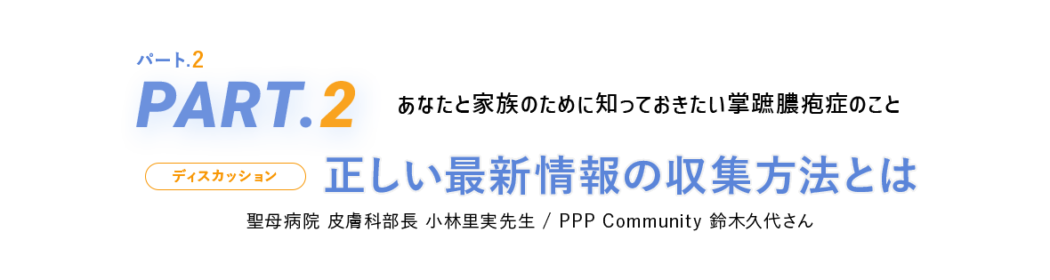 今は、まずインターネットで検索という時代ですよね。しかし、正しい情報とそうでない情報があるので注意が必要です。製薬会社が公開している情報はエキスパートの医師が監修していることが多く、正しい情報が含まれていますが、SNSや一般の方が書いた記事や口コミは正しいとは限りません。掌蹠膿疱症について知りたい方は、掌蹠膿疱症患者会 PPP コミュニティのサイトで「掌蹠膿疱症とは」というページをご覧ください。私が執筆しています。