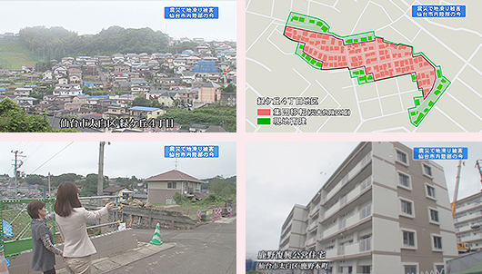 震災では、沿岸部から離れた仙台市の内陸部でも大きな被害を受けました。大規模な地滑りで被害を被った太白区緑ヶ丘4丁目地区。集団移転と現地再建による復旧が進められています。復興公営住宅への入居を待つ世帯、宅地の補修工事で住み続ける世帯を取材しました。「子育ても終わり子供たちも一人前となり、これから皆でお茶のみしたり出来る時期なのに…」と話す住民。今回の震災は、内陸部でも人々の生活に大きな影響を及ぼしました。