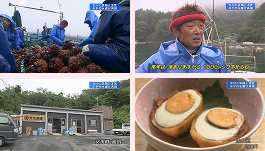 女川町竹浦地区では、養殖ホヤの水揚げが再開しました。生産量は、まだ震災前の3割ほどです。「思ったよりも早く出荷できるようなったが、新たな販路を見つけなければならない」と話す漁師の阿部次夫さん。というのも、原発事故の影響で輸出がストップ。震災前、収穫の8割を韓国に輸出していたそうです。課題は山積みですが、ホヤの水揚げ再開ということで地元の人たちも喜んでいます。克丸鮮魚店の食堂では、郷土料理の「ホヤ玉」が話題を集めています。ホヤの中にゆでたまごを入れ、砂糖やしょう油、酒などで煮付けたもの。女川の中でも、出島あたりでよく食べられていた家庭料理だそうです。