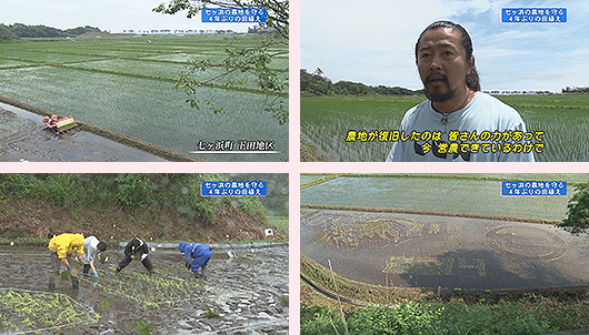 震災による津波で、七ヶ浜町の農地の9割が被害を受け、8割の農家が離農しました。農地もほぼ復旧しましたが、区画整理事業の工事により、今年、営農できる田んぼは震災前の半分。町で一番若い農業の担い手である我妻卓郎さんは、4年ぶりに再開した田んぼで、「田んぼアート」を企画しました。デザインは町章と握手。復旧に携わってくれた人たちへの感謝と、これからもつながっていこうという思いが込められています。全国から集まったボランティアと地元の人たちで田んぼアートは完成しました。「皆さんの力があって、いま営農できている。残った農家で七ヶ浜の農地を守っていきたい」と我妻さんは言います。